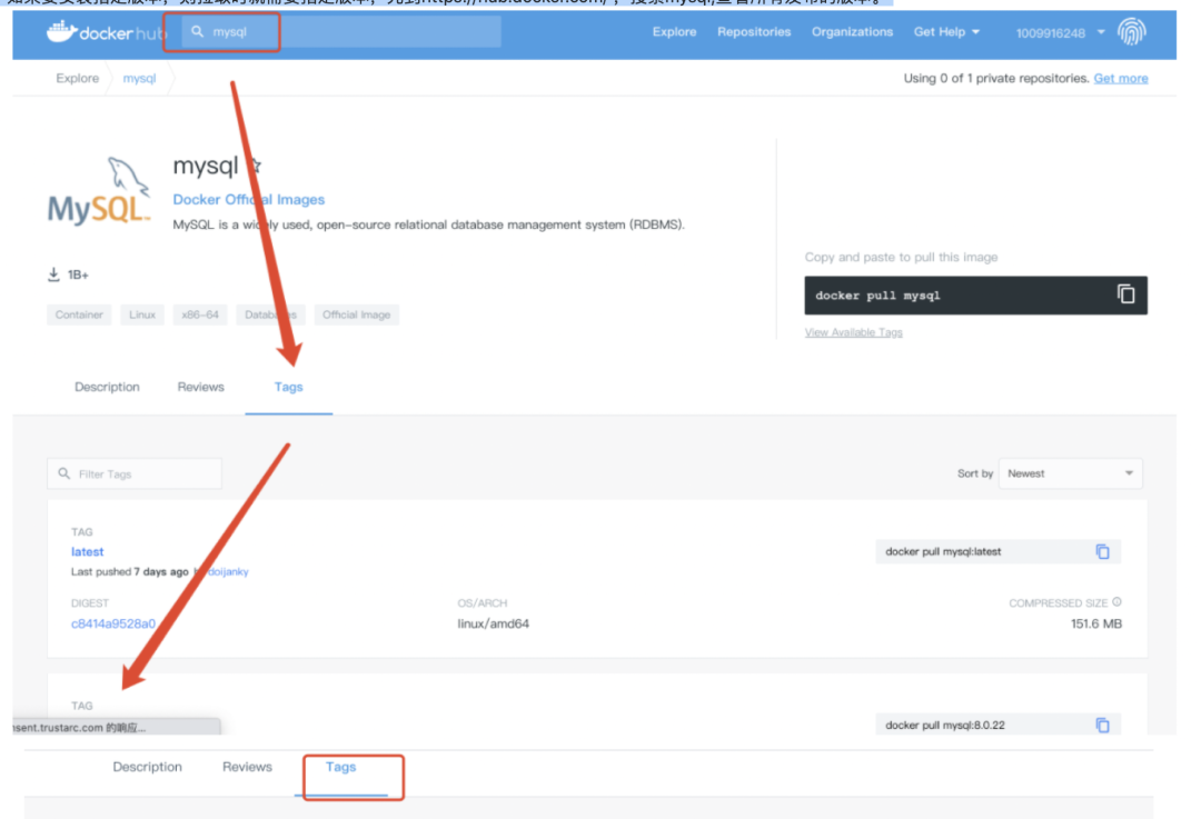 如果要安装指定版本,则拉取时就需要指定版本,先到https://hub.docker.com/ ,搜索mysql,查看所有发布的版本。