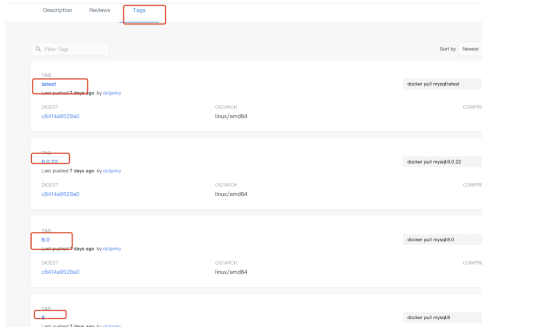 如果直接用命令直接拉取搜索的镜像名称,如docker pull mysql,则下载的是最新版的。
