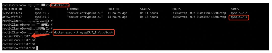 命令进入。af757efcf347 是容器的id,而mysql_5.7_1是容器的名称。