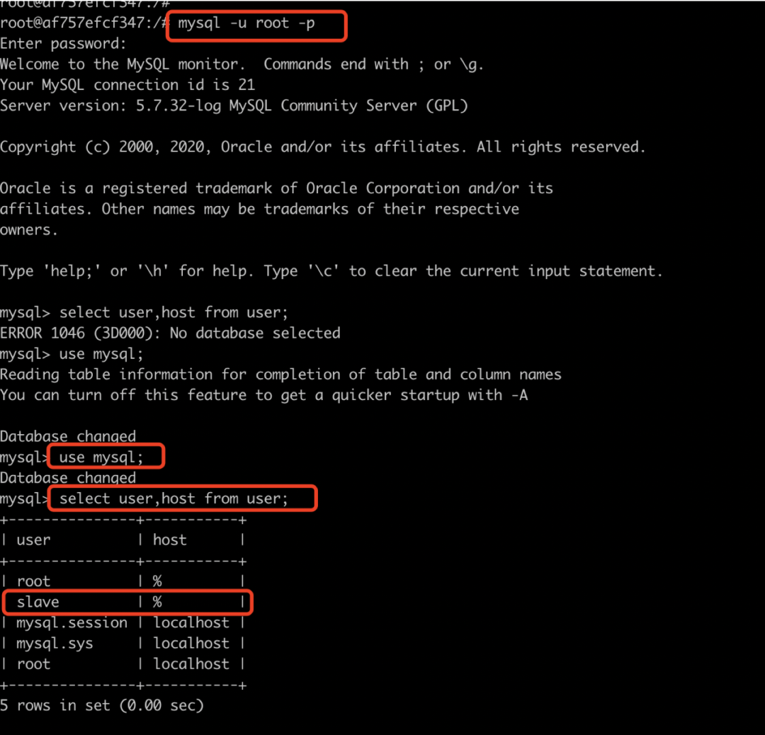 进入mysql5.7_1容器 #在master主机MySQL里执行授权命令