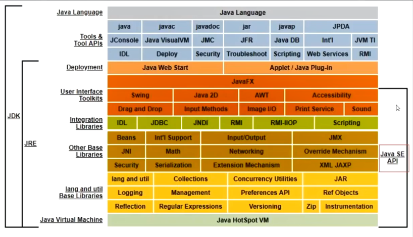 JDK:Java Develpment Kit,Java开发工具,包括Java语句,命令工具集和JRE