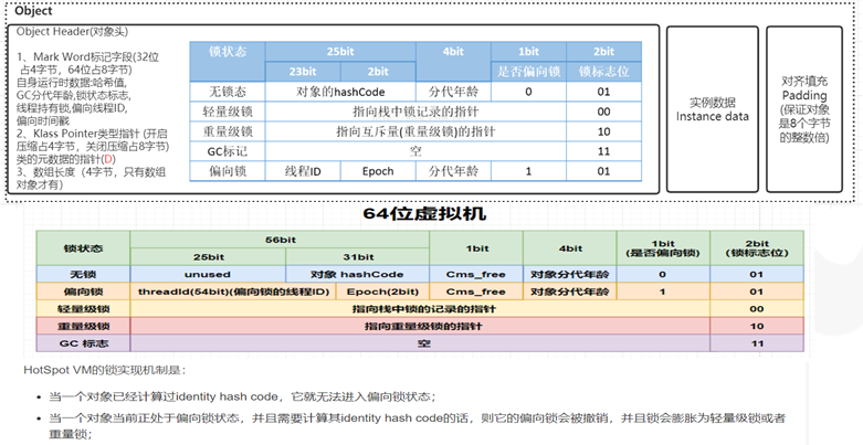 HotSpot虚拟机的对象头包括两部分信息,第一部分用于存储对象自身的运行时数据, 如哈希码(HashCode)、GC分代年龄、锁状态标志、线程持有的锁、偏向线程ID、偏向时 间戳等。