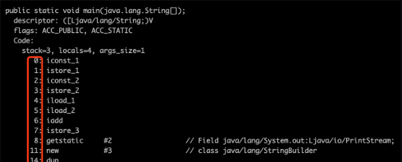 比如如下字节码内容,在每个字节码`前面都有一个数字(行号),我们可以认为它就是程序计数器存储的内容。