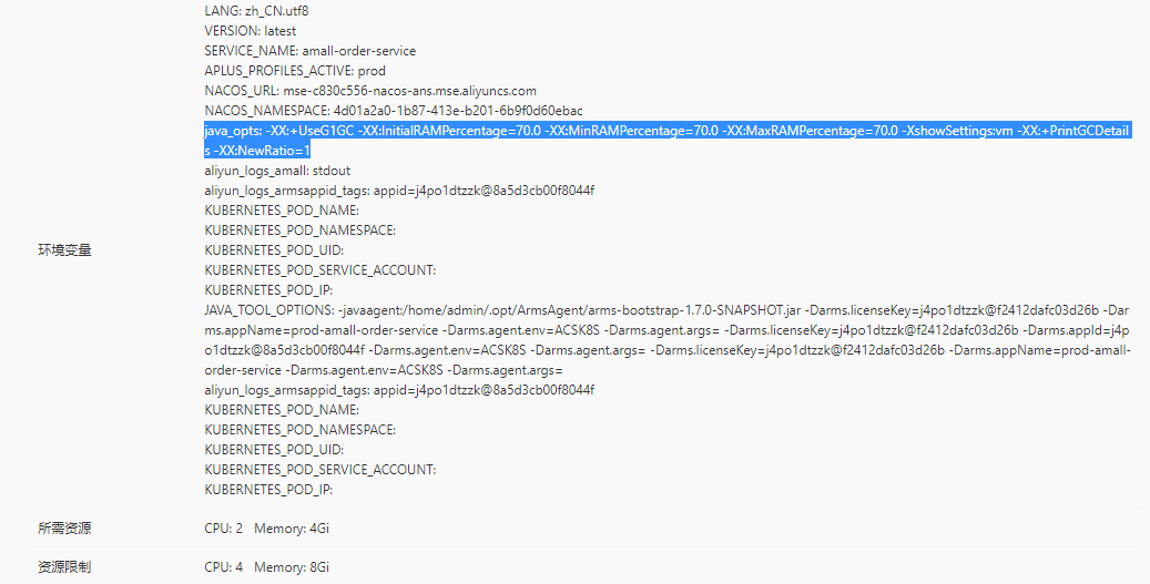 MaxRAMPercentage、InitialRAMPercentage、MinRAMPercentage:容器模式下,给每个JVM实例所属的POD分配的内存上限占POD总内存的比例。