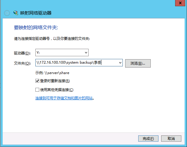 所谓异地备份,就是将服务器端的数据文件,拷贝到本地或者其他地方,以防止服务器崩溃丢失数据文件。可能有人会问,这么简单的事,直接去服务器上将数据文件复制粘贴到本地或其他地方不就解决了。确实,这么简单的事,这么做当然可以,无非就是人肉运维嘛。但是如果我告诉你有很多台服务器(也就几百台吧)需要这么操作,你会怎么办?我猜你每天这样复制粘贴的操作一遍,整个人都不好了。本着能够让电脑帮我们自动处理,坚决不让人来操作的原则,我们来看看如何实现这个自动化异地备份。百度百科给的定义:"映射网络驱动器"是实现磁盘共享的一种方法,具体来说就是利用局域网将自己的数据保存在另外一台电脑上或者把另外一台电脑里的文件虚拟到自己的机器上。把远端共享资源映射到本地后,在"我的电脑"中多了一个盘符,就像自己的电脑上多了一个磁盘,可以很方便进行操作.我们在服务器上添加一个映射网络驱动器,具体操作如下。右击"我的电脑"——选择"映射网络驱动器...",如下图在弹出的对话框中,键入我们要存放数据文件的目标地址,如下图:其中,驱动器就是目标盘符,一般第一次是以Z开始,我的服务器上已经设置过一个,所以这里是Y开头的了。文件夹这里填目标服务器的绝对路径,上图是局域网中一台IP为172.16.100.100的服务器的绝对路径。设置完后,服务器上会多出你刚设置的网络驱动器,如下图:有人会问,这样做的目的是什么?那说明你没有仔细看映射驱动器的定义。目的就是为了能够直接将我们的数据文件拷贝的刚才设置的这个Z盘里,也就是局域网中的另外一台服务器。在我们将数据文件备份到服务器后,开始对文件进行打包和拷贝。这里需要在服务器上安装WinRAR.zip的压缩工具。直接安装到默认路径下即可。然后新建一个bat格式的命令文件,并命名为"数据库备份.bat",保存在D:\的根目录下面,输入如下命令: