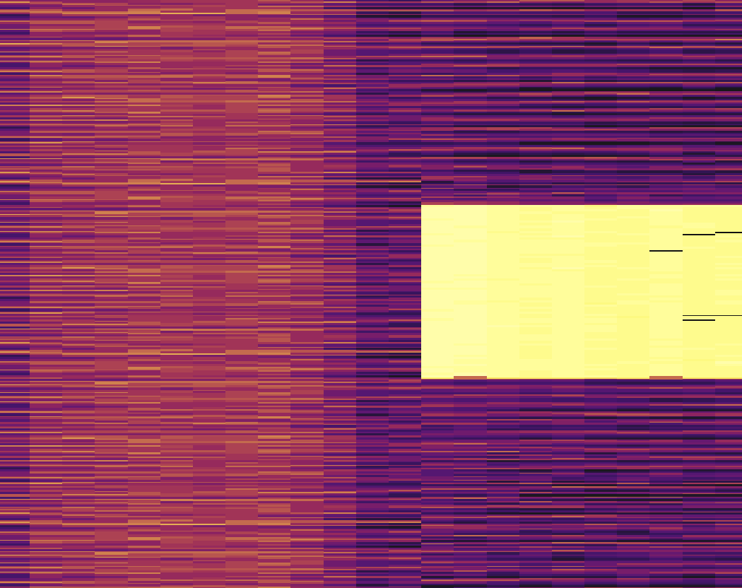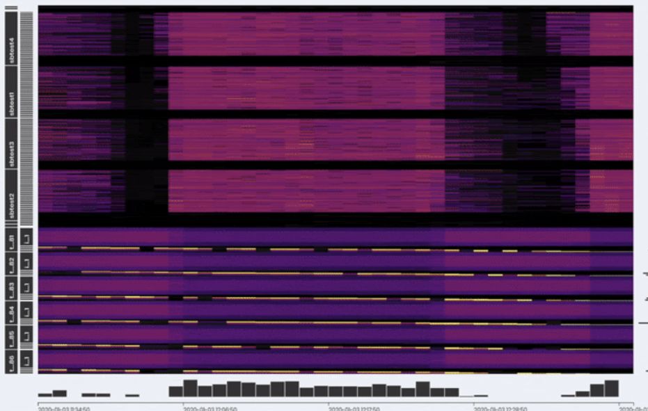 由前文描述可知,热点的本质是大多数读写流量都只涉及个别 Region,进而导致集群中只有个别 TiKV 节点承载了大部分操作。TiDB Key Visualizer 将所有 Region 的读写流量按时间依次展示出来,使用颜色明暗表示读写流量的多少,以热力图的方式呈现。热力图使用户能对集群内 Region 热度情况快速地一窥究竟,直观了解集群中热点 Region 在哪里及其变化趋势,如下图所示: