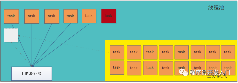 在线程池的编程模式下,任务是提交给整个线程池,而不是直接交给某个线程,线程池在拿到任务后,它就在内部找有无空闲的线程,再把任务交给内部某个空闲的线程,这就是封装