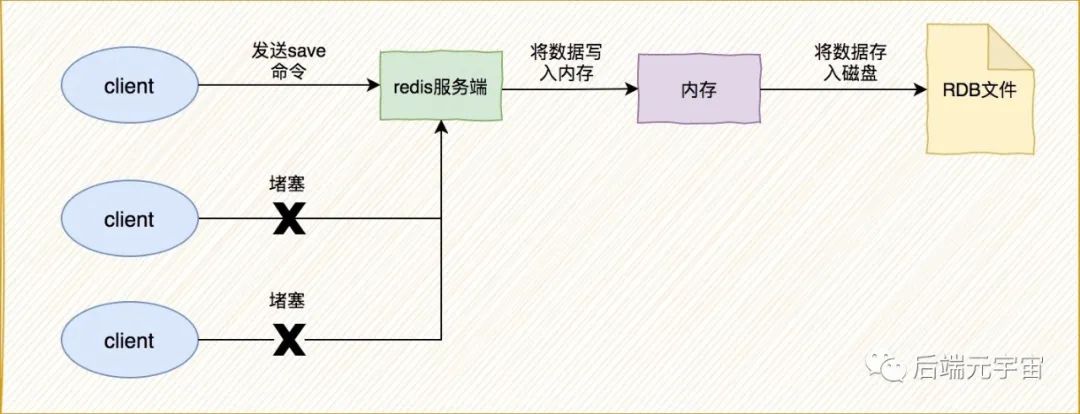 在客户端中执行 save 命令,就会触发 Redis 的持久化,但同时也是使 Redis 处于阻塞状态,直到 RDB 持久化完成,才会响应其他客户端发来的命令,所以在生产环境一定要慎用
