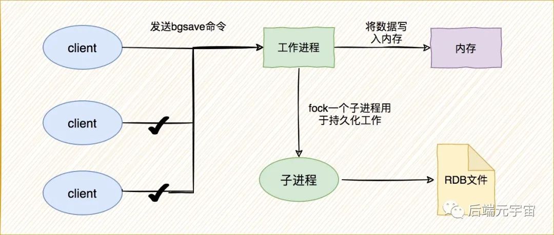 bgsave(background save)既后台保存的意思, 它和 save 命令最大的区别就是 bgsave 会 fork() 一个子进程来执行持久化,「整个过程中只有在 fork() 子进程时有短暂的阻塞」,当子进程被创建之后,Redis 的主进程就可以响应其他客户端的请求了,相对于整个流程都阻塞的 save 命令来说,显然 bgsave 命令更适合我们使用。