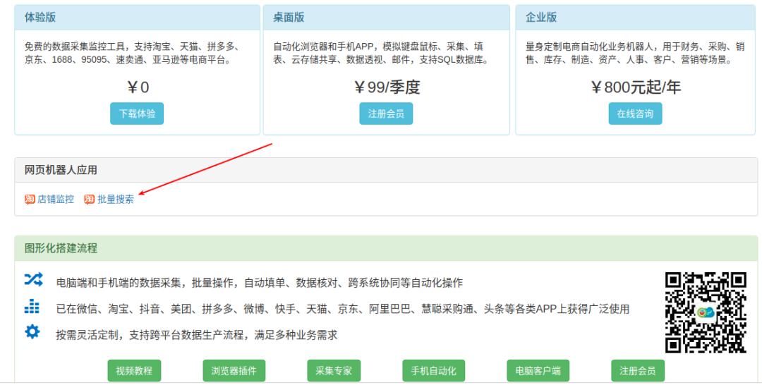 第1步:在电商记网站首页点击“批量搜索”,即可打开面板。