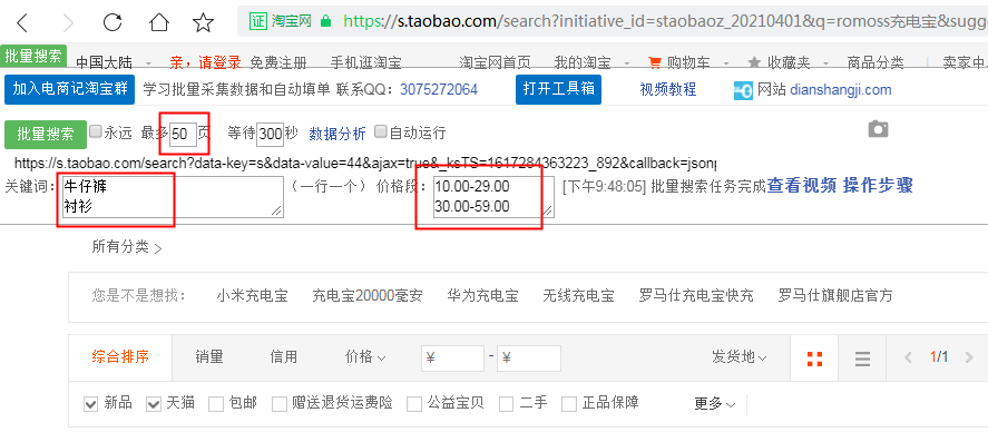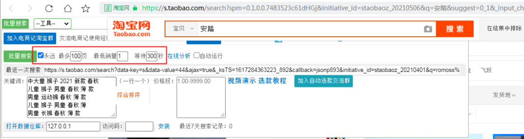 建议购买99元1年的云服务器,选择“永远”选项,最多100页,最低销量1,每页等待300秒,然后再点击“批量搜索”按钮。