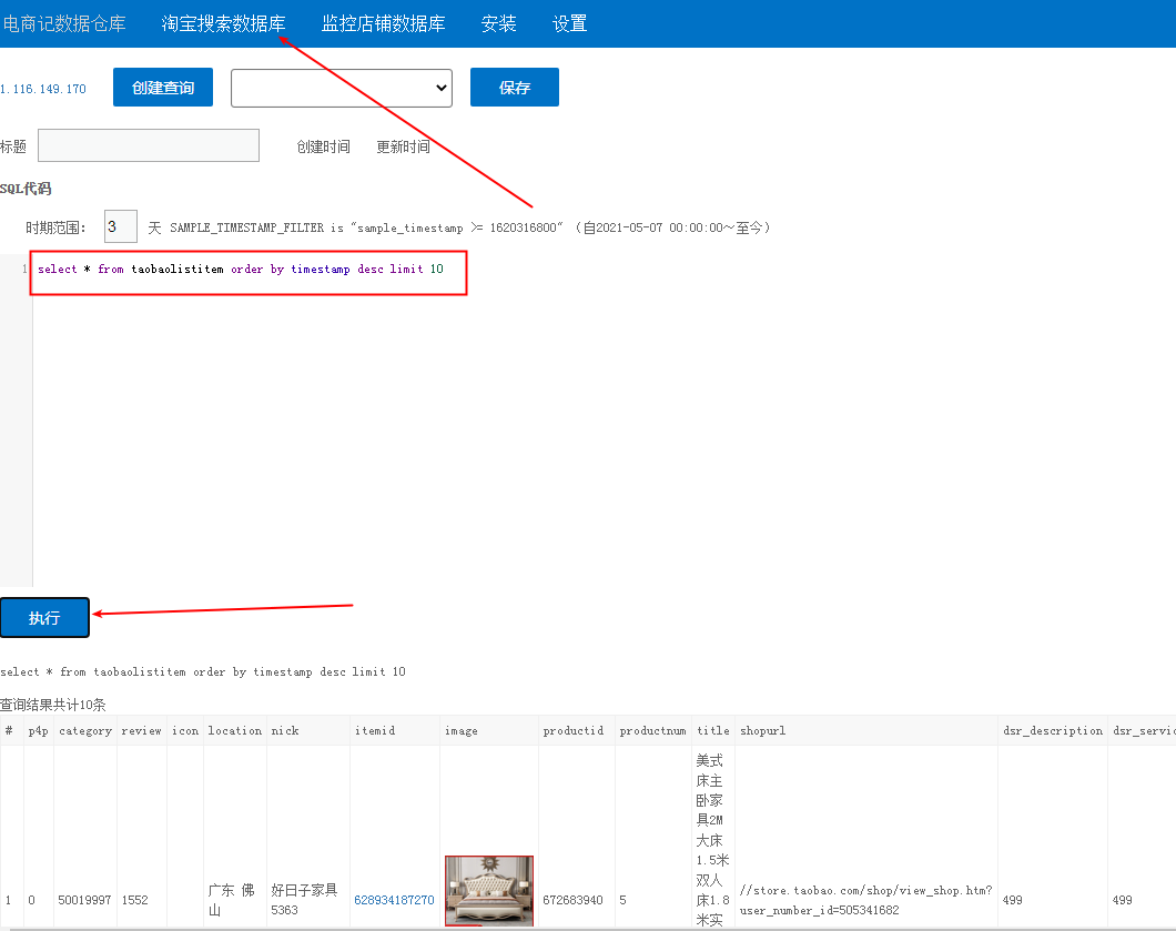 淘宝搜索数据库的表格名称是“taobaolistitem”,用户可执行标准的SQL查询语句。