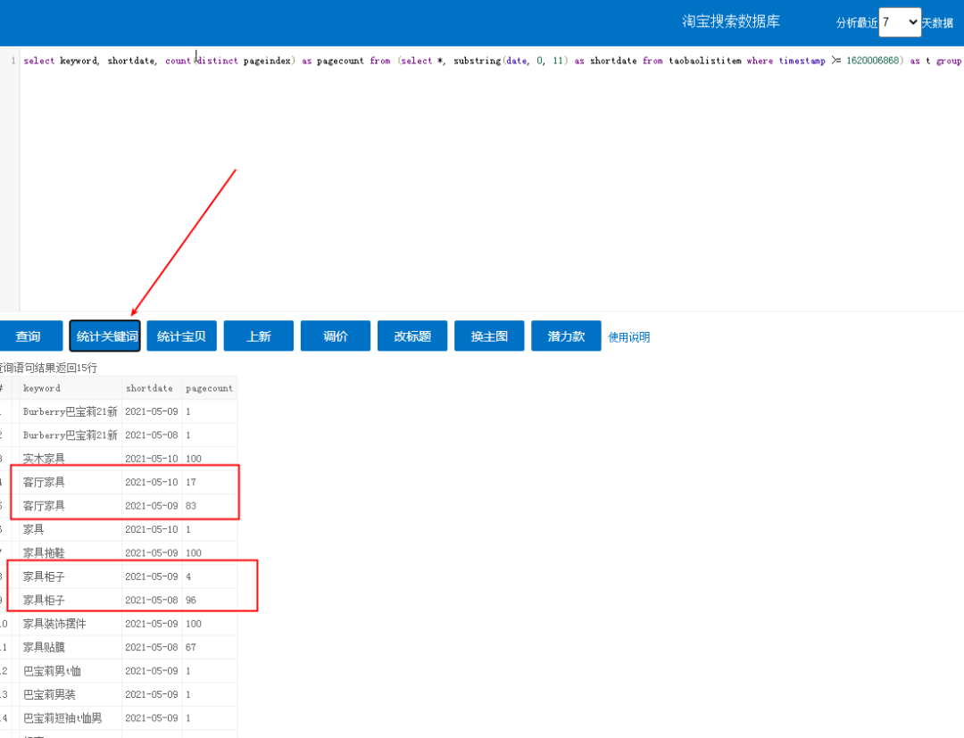 如图中所示,“客厅家具”在2021-05-10和2021-05-09分别采集了17页和83页,总计100页,说明这个关键词是在零时采集的,实际上只能算是一天的数据。另一个“家具柜子”也是类似。