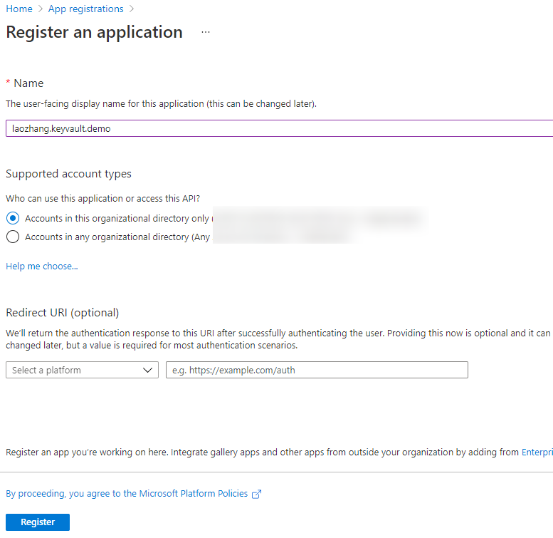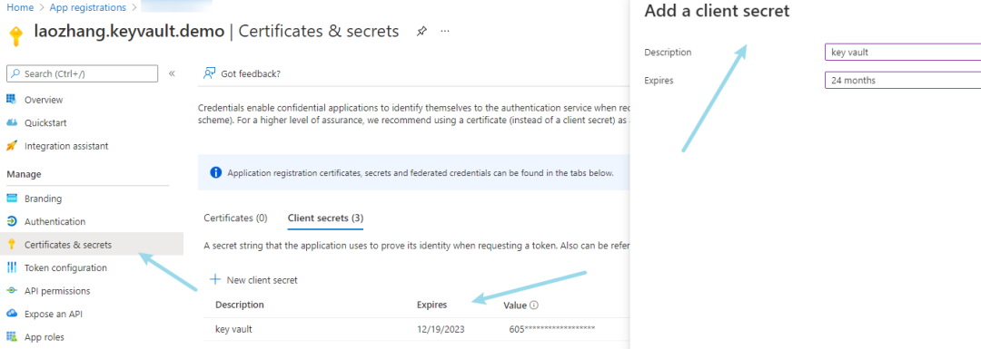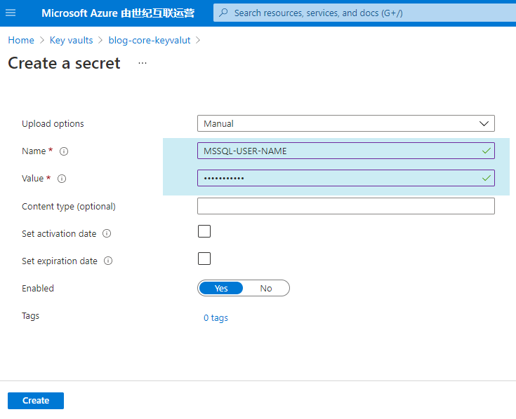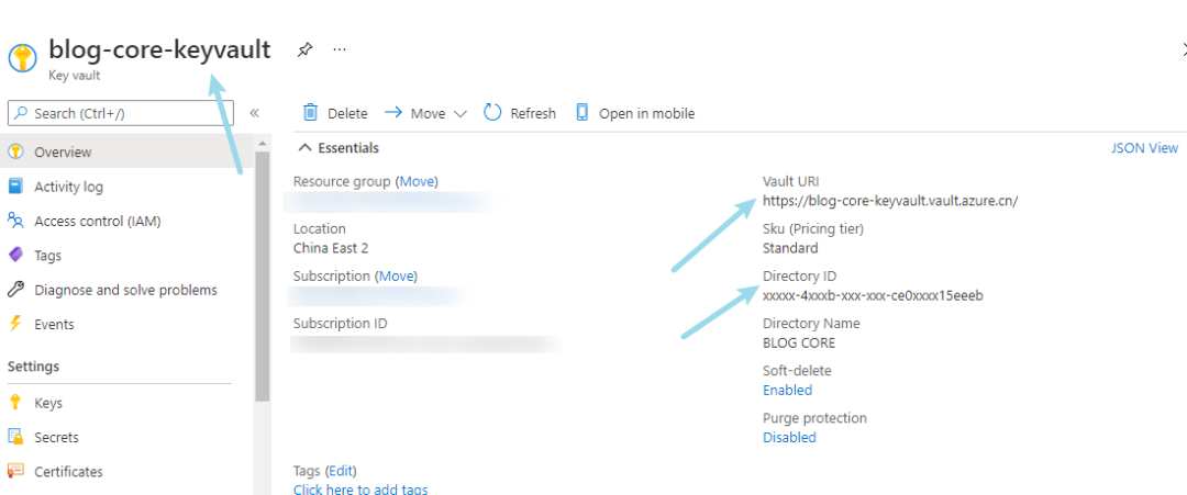 azure.keyvault.enabled=trueazure.keyvault.uri=https://blog-core-keyvault.vault.azure.cn/azure.keyvault.client-id=你的应用idazure.keyvault.client-key=你的应用密钥azure.keyvault.tenant-id=你的tenantidazure.keyvault.authority-host=https://login.chinacloudapi.cn