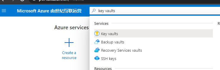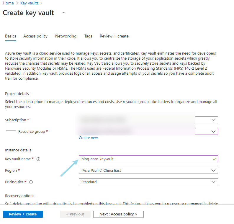 创建一个全新的key vault服务,选择自己的订阅和资源组,设置下名称