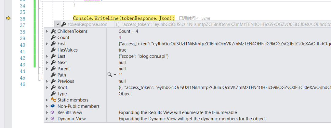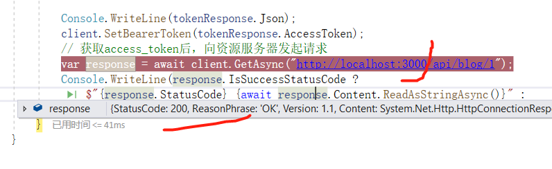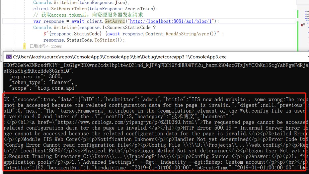我已经对部分地方加了注释,相信你应该能看的懂,简单来说,就是通过账号信息向Ids4认证中心(5004)发起请求,获取到access_token,然后带上这个token向资源服务器(8081)发起请求,没错就是我们的Blog.Core项目,注意这个代码是is4分支的,不是master的。