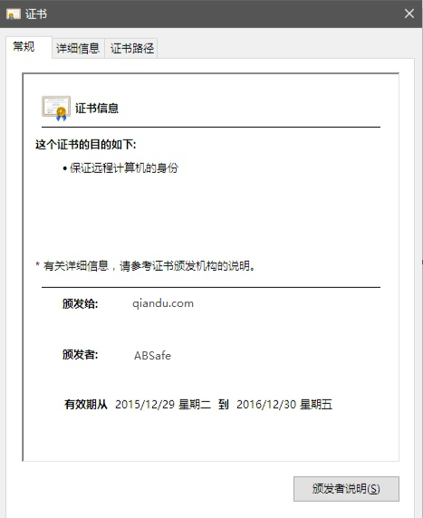 “这证书颁发机构叫 ABSafe,不在我们受信任的列表中!再说了,我这里有缓存千度网的证书,根本不是这样的,这肯定是假的,你看!”