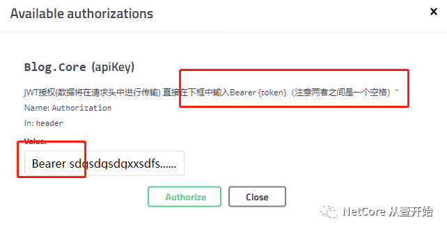 大家点开,看到输入框,在输入Token的时候,需要在Token令牌的前边加上Bearer (为什么要加这个,下文会说明,请一定要注意看,一定要明白为啥要带,因为它涉及到了什么是授权,什么是认证,还要自定义认证中间件还是官方认证中间件的区别,请注意看下文),比如是这样的: