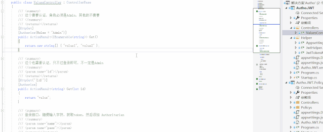 // 1【授权】、这个和上边的异曲同工,好处就是不用在controller中,写多个 roles 。// 然后这么写 [Authorize(Policy = "Admin")]services.AddAuthorization(options =>{options.AddPolicy("Client", policy => policy.RequireRole("Client").Build());options.AddPolicy("Admin", policy => policy.RequireRole("Admin").Build());options.AddPolicy("SystemOrAdmin", policy => policy.RequireRole("Admin", "System"));});