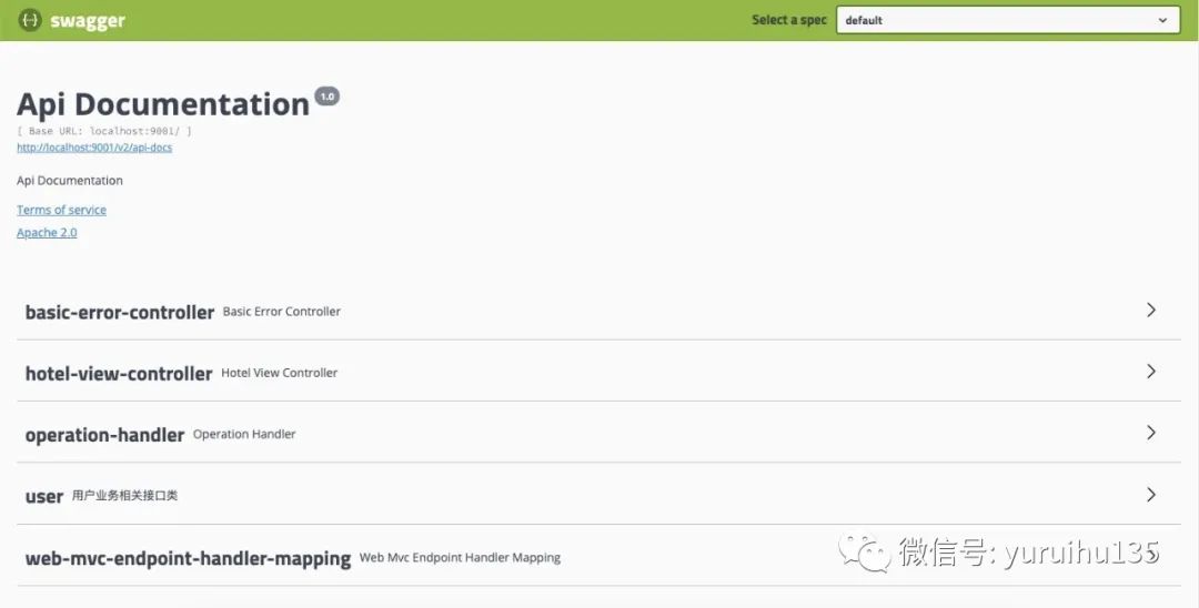 通过上述两个方法的配置,我们就完成了 Swagger-UI 的基本配置,启动项目之后,在浏览器地址栏中输入访问路径(一般为项目 ip 地址:端口/swagger-ui.html)就可以在浏览器中看到 Swagger-UI 的界面效果了。