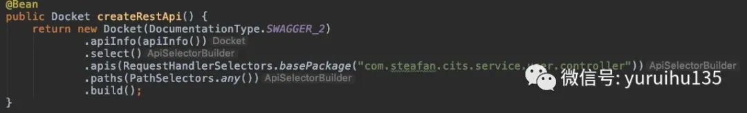 在方法内部,使用匿名内部类的方式实例化了一个 Docket 对象并返回,DocumentationType 即文档类型的选择我们需要根据集成的 Swagger 的版本来选择,这里选择 SWAGGER_2 表示使用的 Swagger 是2.X系列版本。
