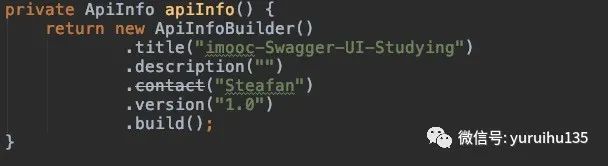 apiInfo 方法返回 Swagger-ApiInfo 类型,大家可以理解为返回 Swagger-UI 界面的基本信息就行了。在方法内部也是通过匿名内部类的方式返回一个 ApiInfo 实例。