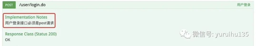 在我用红框圈起来的地方我们可以看到 Implementation Notes 下放就是我们对该接口的进一步详细描述,其显示在了接口的主要内容区域里面。