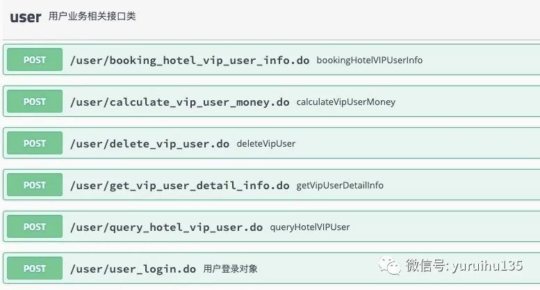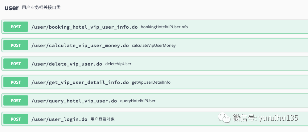 在底部最开始的地方,我们可以看到 “user:User Controller” 等字样,这是我们使用 @ApiOperation 注解的 tags 属性来为接口描述的分组名称,当我们点击 user 之后,字体会加粗显示,同时会列出所有属于该 user 分组的接口列表,如下图所示: