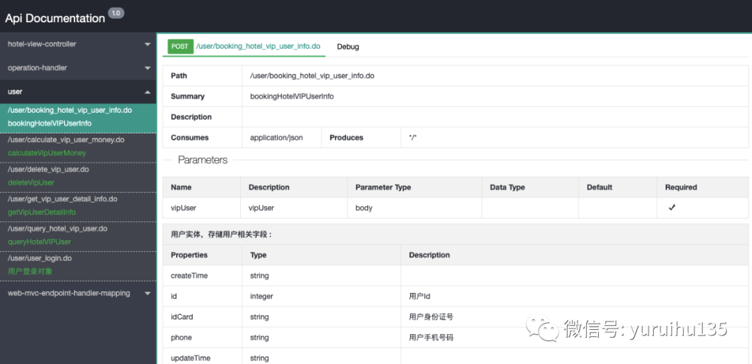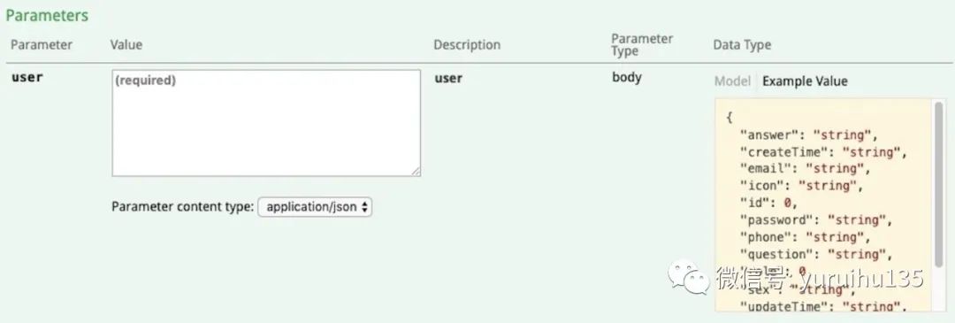 Parameter 列表示接口的请求字段名称,就是接口的请求值,这里描述的是一个 user 对象。