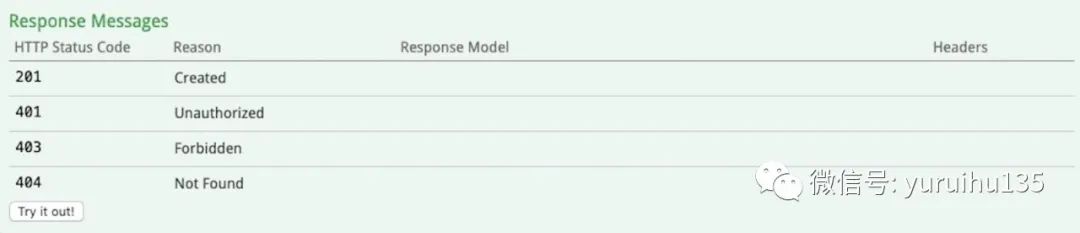 在左下角有一个 Try it out! 按钮,该按钮就是用来调试接口的。具体如何调试接口本节不做介绍,我会使用专门一节的内容来介绍如何使用 Swagger-UI 进行接口调试。