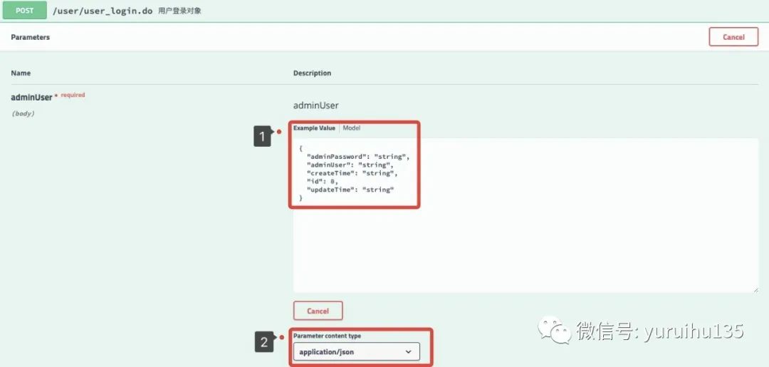 我们需要在标签 2 的位置选择请求接口的请求头类型,一般都为 application/json 类型,这也是 Swagger 默认自带的类型,一般不需要再次选择。