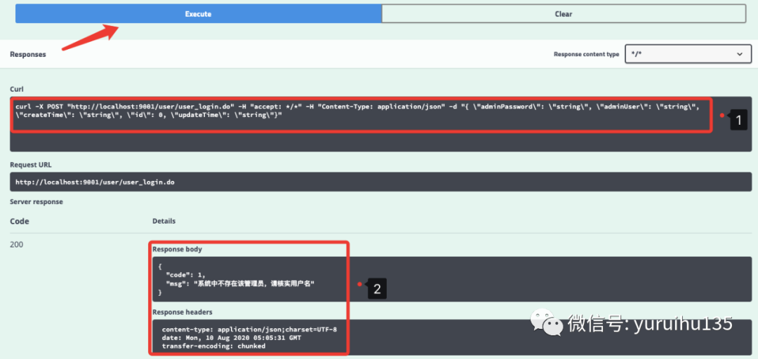 在上述内容中,我们已经对 Swagger-UI 界面进行了基本详细的介绍。我们以一个用户登录接口为例,来看看如何在 Swagger-UI 界面上进行接口自测试。