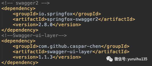 <dependency><groupId>io.springfox</groupId><artifactId>springfox-swagger2</artifactId><version>2.8.0</version></dependency><dependency><groupId>com.github.caspar-chen</groupId><artifactId>swagger-ui-layer</artifactId><version>1.1.3</version></dependency>