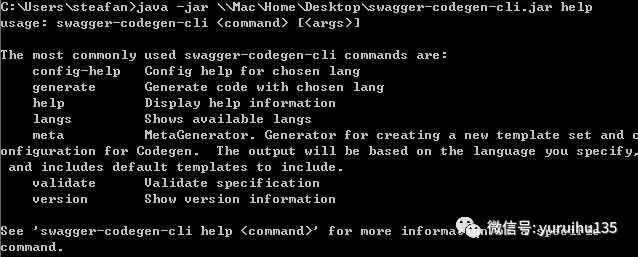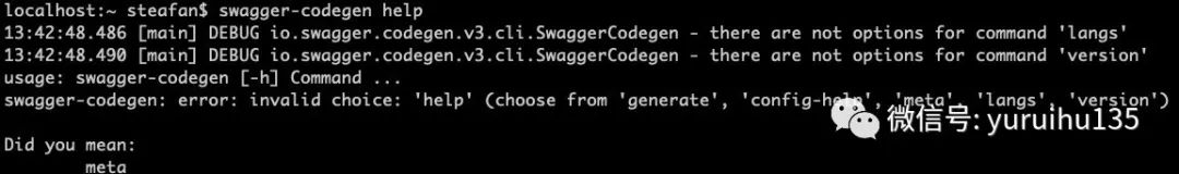 可以看到,当我们输入 help 命令时并不会提示我们像 Windows 环境中的信息,这是因为在 Mac 环境中 Swagger-Codegen 所使用的命令格式和 Windows 中的不一样导致,这里就不再详细介绍了。
