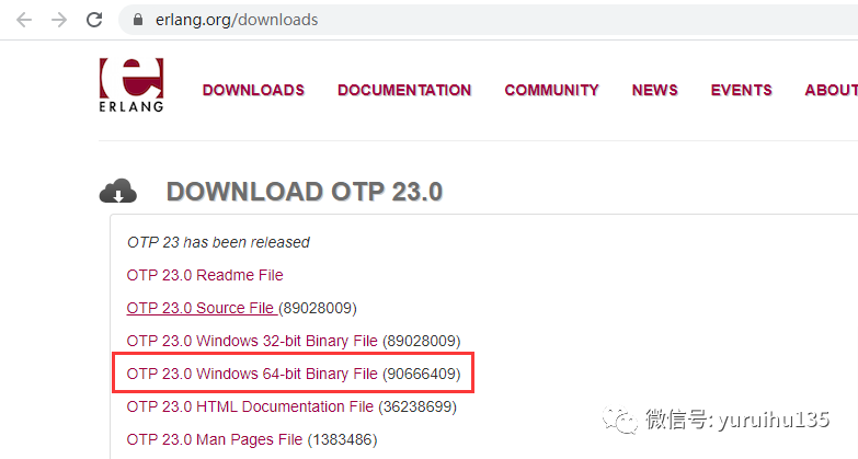 erlang 官网针对不同平台,为我们提供了许多不同格式的文件包,我们可以根据自己所在平台来选择采用哪种格式的文件包,来安装 erlang 语言支持库。这里以 Windows 平台为例,打开这个链接:https://www.erlang.org/downloads 我们可以进到 erlang 的官网下载界面,如下图所示: