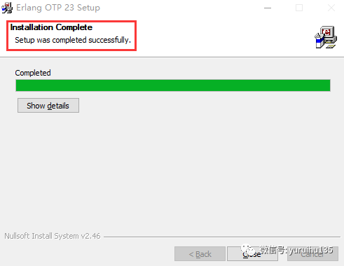 安装完成之后,我们会在安装过程提示界面看到如下红框所描述信息,代表我们已经把 erlang 语言支持库安装到我们的本地电脑中了,我们只需要点击 Close 按钮,关掉安装过程提示界面即可。
