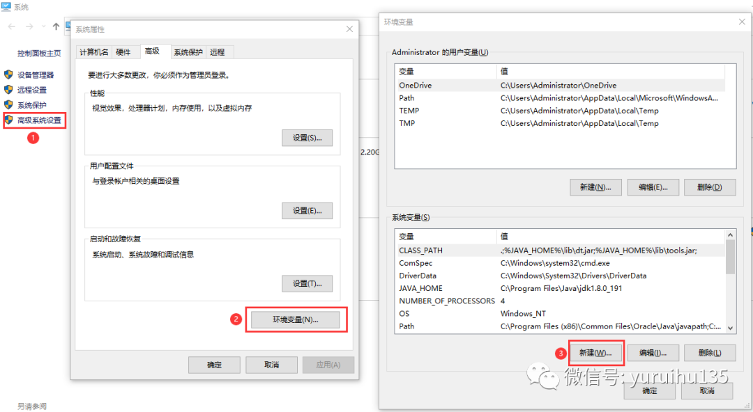Windows 系统下,我们可以右键 ‘此电脑’,找到属性,然后选择高级系统设置下的环境变量,点击新建,如下图所示: