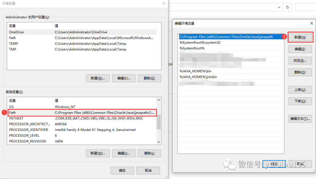 同样的,在系统变量下,找到 Path 属性,双击打开,在打开之后的对话框中的右上角,点击新建按钮,如下图所示: