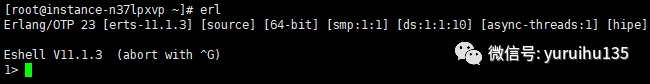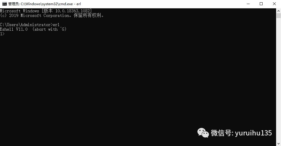 打开命令行之后,在里面直接输入 erl ,然后敲回车,如果可以看到我们安装的 erlang 的 Eshell 版本号,即表示 erlang 语言支持库已经被全局配置到了我们自己的本地电脑中,可以开始安装 RabbitMQ 了。