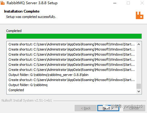 等待安装过程结束,看到如下截图,即说明 RabbitMQ 安装成功: