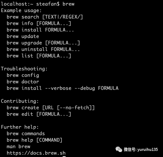 在安装之前,请确保自己的 Mac 电脑中已经具备了 HomeBrew 包管理工具,具体的我们可以输入 brew 命令进行检查,在输入 brew 命令之后,出现下图提示,则说明 HomeBrew 已经在我们的电脑中了。
