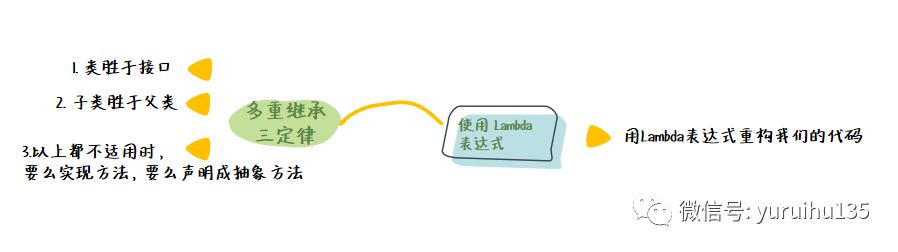 public class CombineBox implements RedBox ,BlueBox { public String color (){ return RedBox .super .color (); } } 上述的内容我们主要是对默认方法的工作原理做了一个简单的介绍,对于默认方法通常有三条定律来帮助我们使用默认方法:
