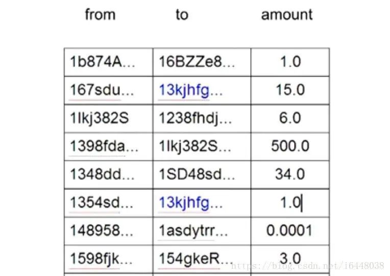 这个账本中“from” 和 “to” 代表的是不同的比特币地址,可以理解为比特币账户,在比特币世界中,是没有账户余额概念的,只有一笔笔的从一个账户转到另外账户的转账信息。每当发起一比交易的时候,比特币系统会先通过你的比特币地址查到你之前的所有交易记录,看你是否有足够的钱去支付这笔交易。