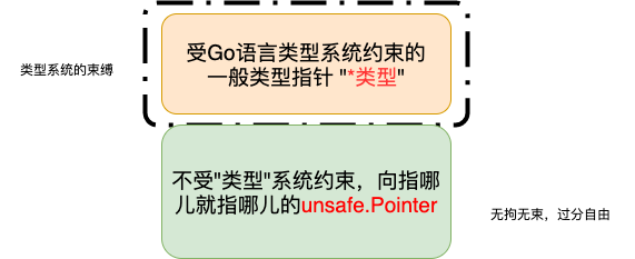 ,多用于Go的编译时期;由于它可以绕过类型系统,直接去访问内存,所以它用起来效率会比较高,但是官方的态度是不太建议使用的,因为不太安全。我个人建议也是能不用就不用:毕竟为了这点儿效率带来的额外的附加成本比较高。