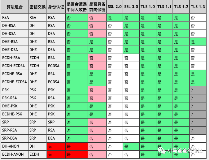 为了避免遭遇 MITM 攻击,DH 需要与其它签名算法(比如 RSA、DSA、ECDSA)配合 — — 靠签名算法帮忙来进行身份认证。当 DH 与 RSA 配合使用,称之为“DH-RSA”,与 DSA 配合则称为“DH-DSA”,以此类推。反之,如果 DH 【没有】配合某种签名算法,则称为“DH-ANON”(ANON 是全称“匿名”的简写)。此时会遭遇“中间人攻击/MITM”。(具体的中间人攻击手法,可以参见本系列前一篇)