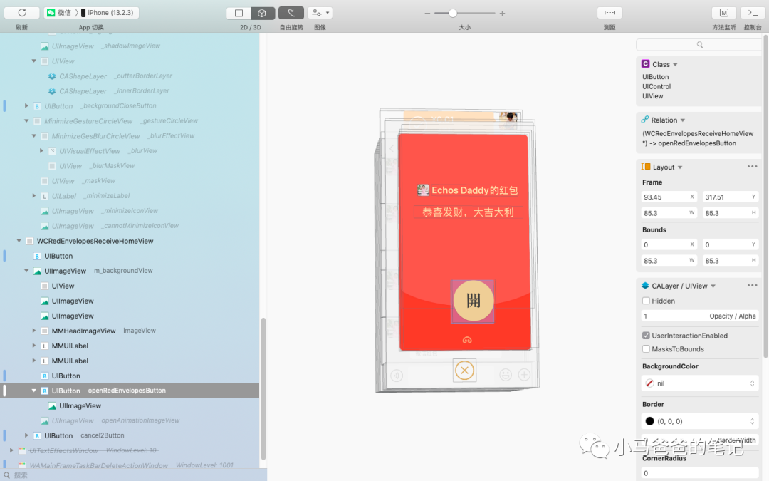 这里暂时没有去分析,因为时间不够了,先讲讲代码。在Lookin里面看到openRedEnvelopesButton