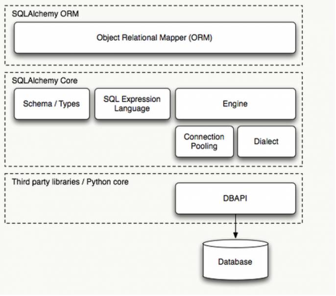 如图所示,sqlalchemy主要分为三个模块: