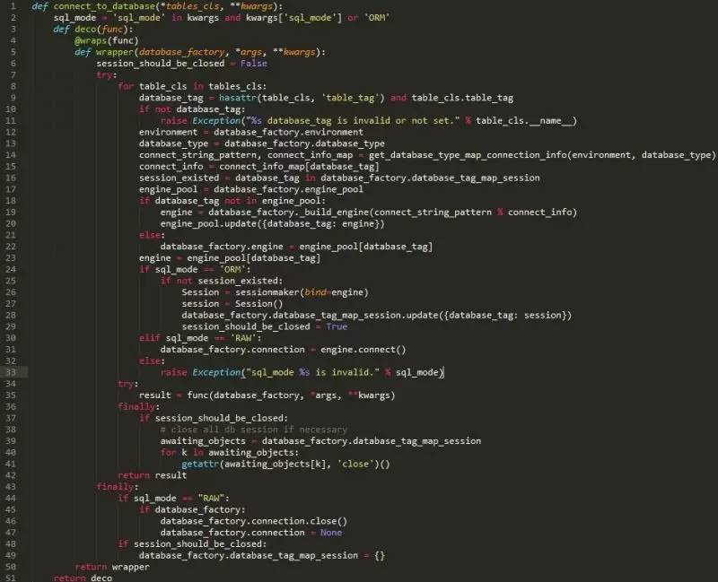 connect_to_database装饰器:通过对database_operator模块中方法装饰(主要获取数据库表的映射类),完成数据库engine和session的创建,支持多个数据库session的建立,同时支持使用sqlalchemy的三种方式;