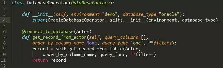 定义了具体的操作表的方法,被connect_to_database装饰,调用database_factory中公共方法;