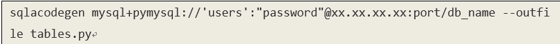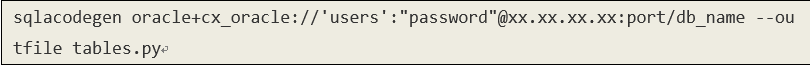 python库sqlacodegen可以自动生成models文件,我们的自动化框架中支持oracle和mysql数据库,使用sqlacodegen产生这两种数据库映射类的语法如下: